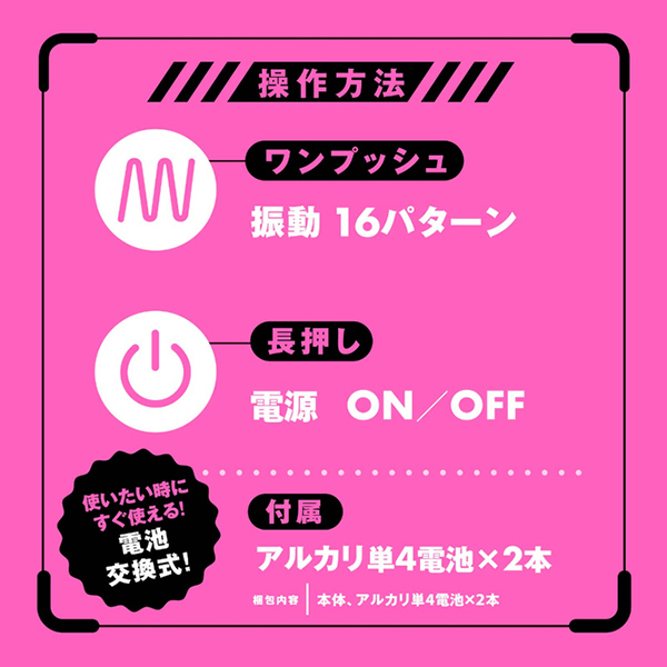 驚異的な振動快感!16パターン振動のハイパワーローター搭載! 痛気持ちよく挟まれちゃうクリップタイプの乳首ローター!ちょうどいいプレス感と振動刺激でWの気持ちよさ! 超豊富な16パターンの振動責めでビーチクでイっちゃう!!! 1人でチクニー!パートナーと2人で開発プレイもアリ///楽しみ方無限大! 検査番号:2500426 振動16パターン_防水機能IPX5等級 付属品:アルカリ単4電池×2本 ※IPX5:放水ノズルを使って噴流水を最低3分間あてる試験(浸水は不可となります) ※リモコンに防水機能はありません。 付属品:アルカリ単4乾電池×2本 本体サイズ:9.9×3.5×2.6cm 重量:37g パッケージサイズ:15.5×9.5×5cm |