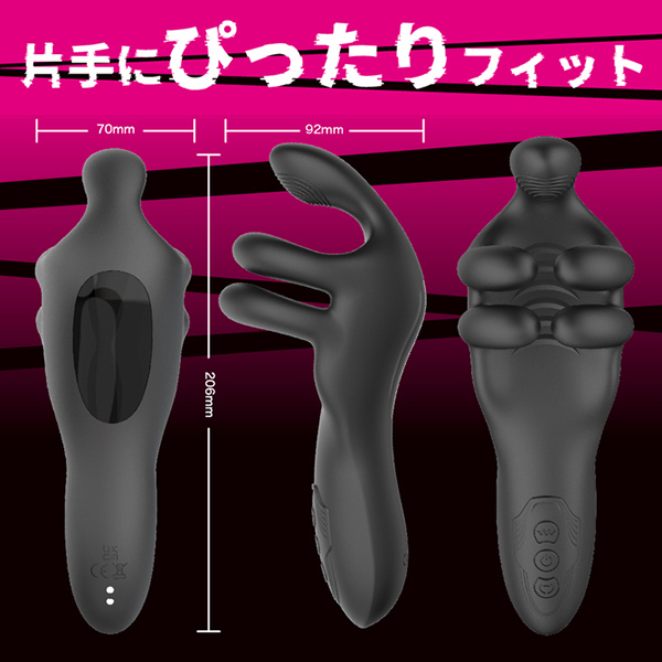 5本の指が理性を削ぎ落とす!振動しながら揉みしだく快感を体感せよ! 多様な振動はなんと10段階。 好みの強さで振動させることができます。 さらに、10段階の揉み仕様も追加。 複雑な動きであなたを快感の極地へ導きます! 【鷲掴みの圧迫、強烈振動と激烈揉み】 どんなサイズにもピッタリフィット。快感はあなたを絶対に逃さない。 1本が先端を圧迫!残りの4本はサオを掴んで全体に刺激を伝えます。 【使用後もラクラクIPX6生活防水】 使用後も水洗いできて清潔。洗浄に手間はかかりません。 ※水洗い後は水気を優しくふきとってください。 【画期的な充電システム】 磁気充電でコンパクト。 さっと充電できるので手間なしラクラク。 あなたも竿モミ中毒の快感のトリコになりませんか? 本体サイズ:20.6×7×9.2cm 重量:275g パッケージサイズ:24×10.1×9.3cm 付属品:充電ケーブル |