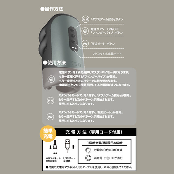 あらゆる角度で揉む、圧迫、振動。 1000通りの動きで完全刺激。 製品説明:簡単操作で1000通りの完全刺激。 装着するだけでコスらなくてもイケちゃう?! いつもと違う刺激が攻め立てる究極マシーン! 医療グレードのシリコンが優しく包み込み、パワフルモーターで揉んで、 圧迫ビートで刺激され、強振動が同時にせめる! 本体サイズ:H14.0×W7.1×D8.7cm 重量:104g パッケージサイズ:H16.4×W11.3×D8.0cm 【USB充電式】 |