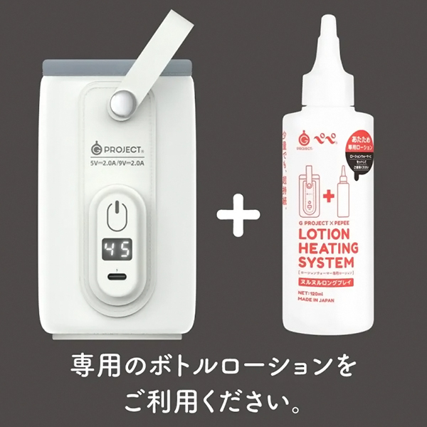 ローションぽっかぽか!ボトルローションをそのまま温めるだけ!最大温度45度まで温まるローションウォーマー![ローションウォーマー専用ローション]をご使用いただくことで、30分で45度まで温まる急速加熱機能搭載!※2.0Aアダプタ使用時。デジタルディスプレイで温度が確認できるので、お好みの温度での使用も可能です!45度まで上昇すると、温度は45度で一定にキープされます。温まりすぎの心配もなし!電源アダプタ、モバイルバッテリー、PCなど様々な電源機器にも対応!いつでもどこでも!ローションぽかぽか、ぬくぬくオナニー! G PROJECT × PEPEE LOTION HEATING SYSTEM[ローションウォーマー専用ローション]のご使用を推奨しています。検査番号:2105412