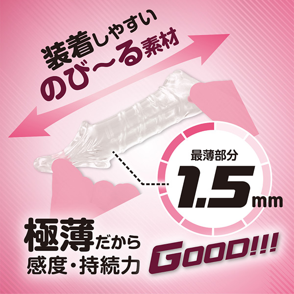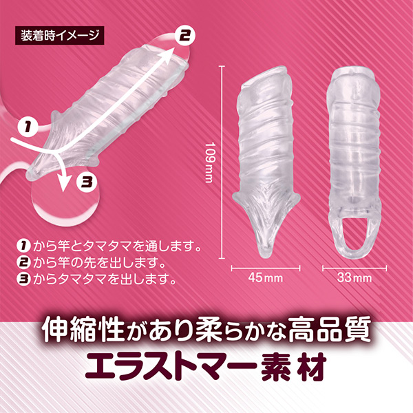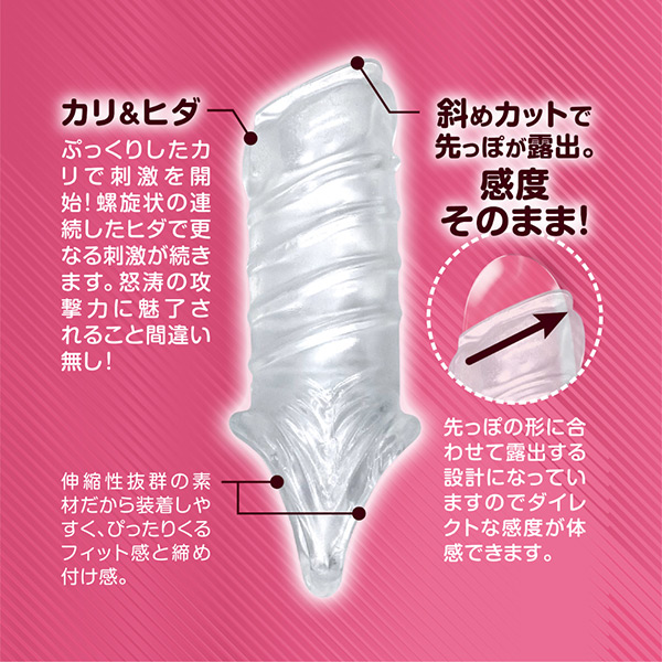 素材はエラストマーなので伸縮性があり幅広いサイズの方にご使用頂けます。 無限ドット、螺旋ヒダ、異次元ループ、カリ&ヒダの 4種の中からお好み刺激をパートナーと楽しんでください。 本体サイズ:10.6×4.5×3.5cm パッケージサイズ:H14.9×W8.0×D5.0cm |